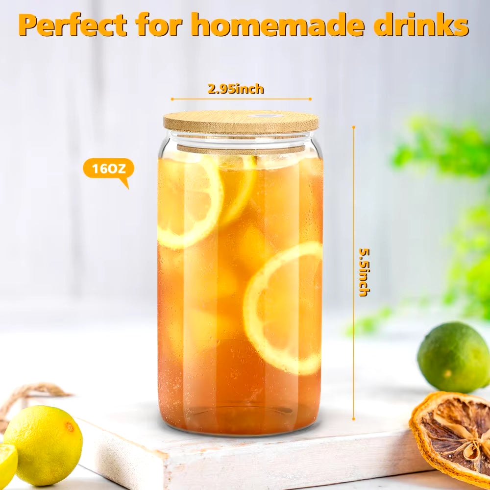 4PCS Glass Cups with Bamboo Lids and Straws 550ML Ice Coffee Cup Drinking Cup Set with Wooden Lids Home Essential Glass