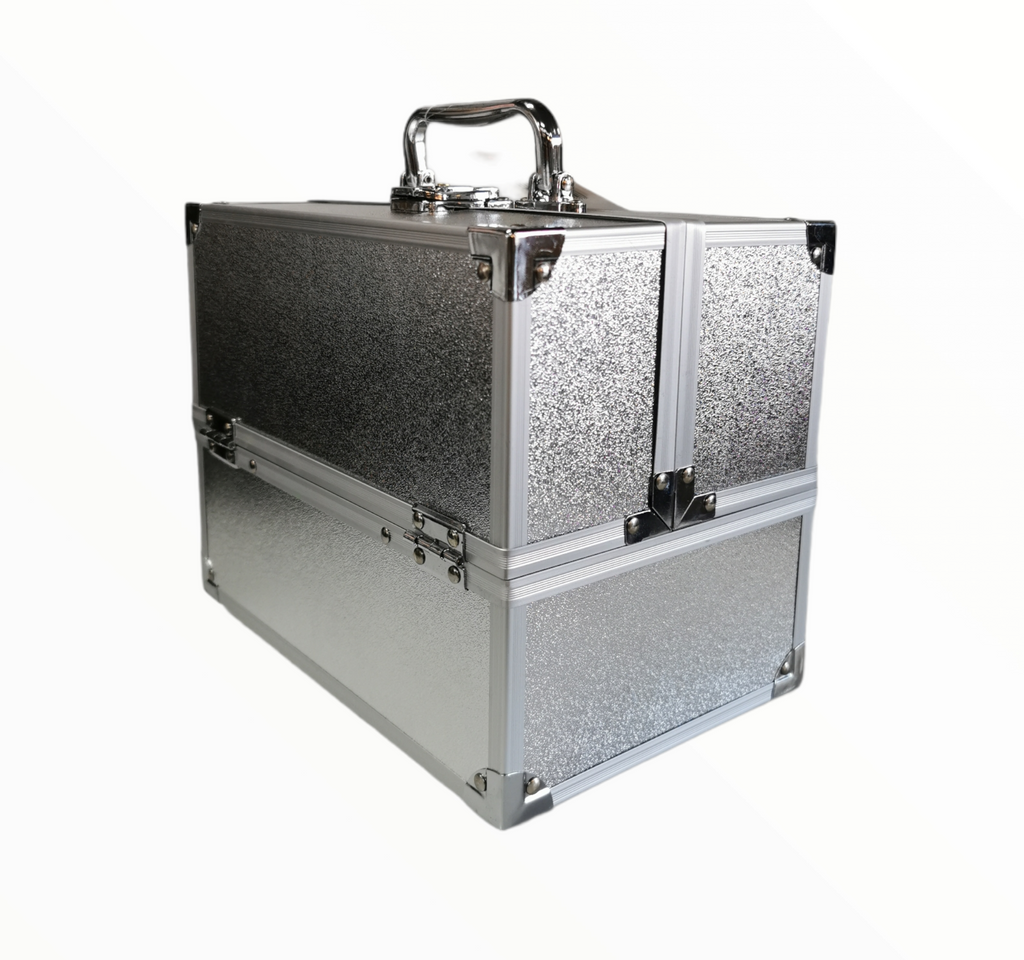 - The case has an aluminum frame with sturdy body. the Top Compartment is designed to store smaller beauty items with 6 individual storage trays that opens up and stacks back to one, easy access to different layers.