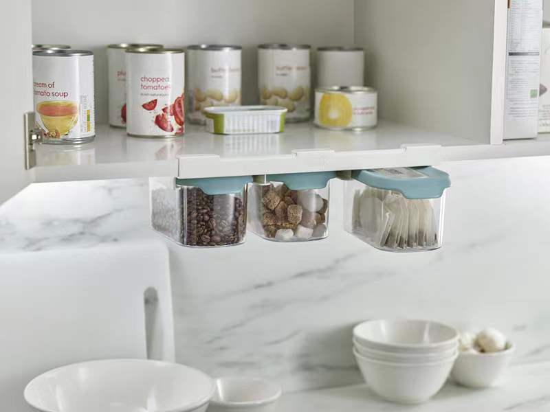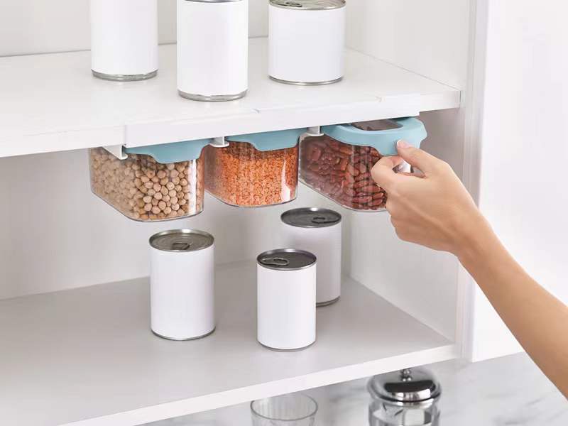 This innovative food storage set makes use of unused space beneath the shelf, thereby maximizing every inch of cupboard area.