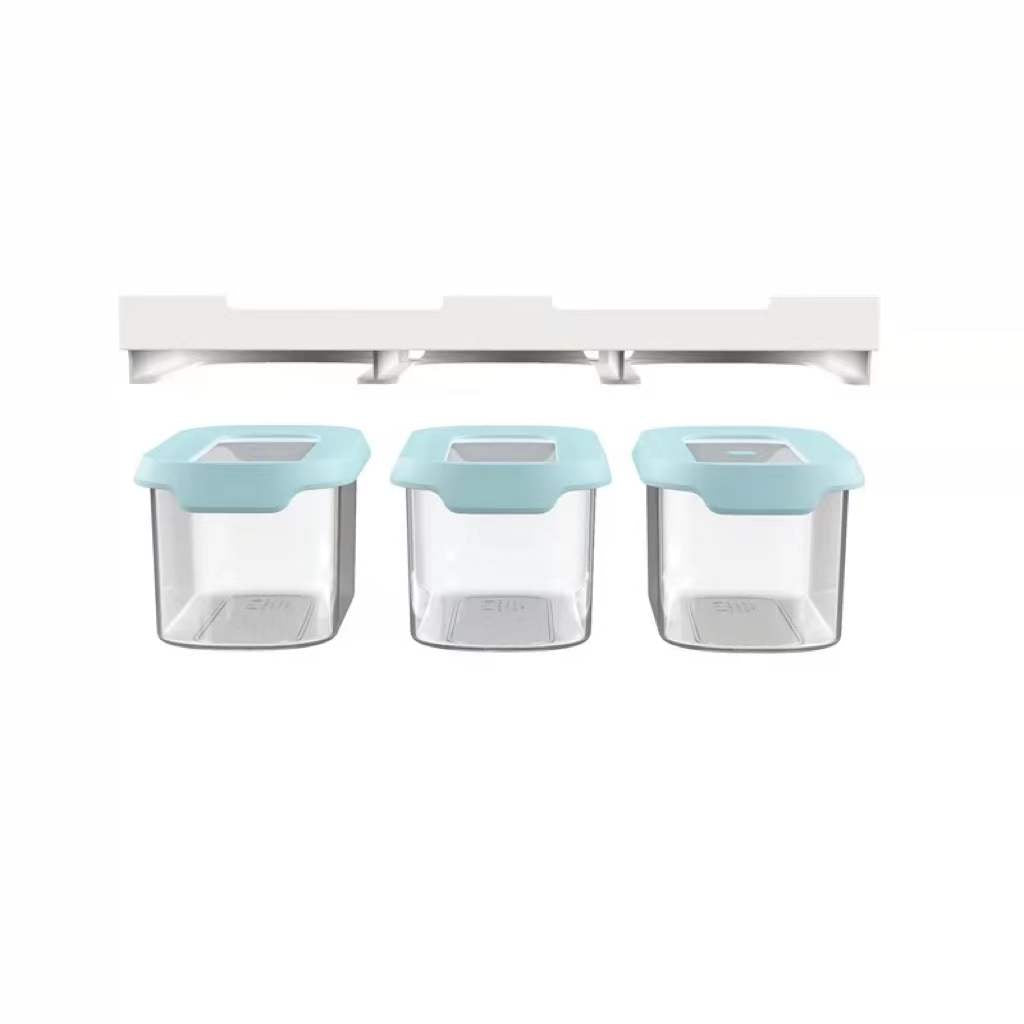 The set includes three 1. 3 qt (1. 3-litre) clear plastic containers that hang neatly from a sturdy rail, which attaches to your existing shelf using strong 3M VHB tape. The containers all have airtight lids with easy-pull tabs and easy-pour corners.