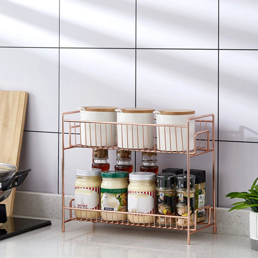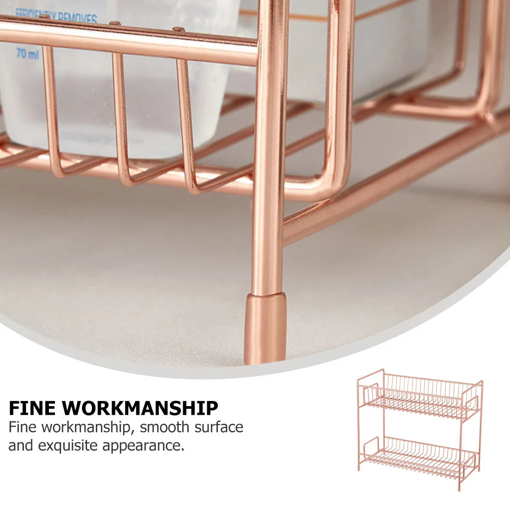 This dual-layer storage rack is durable and practical, with smooth surface, exquisite appearance, strong load-bearing, not easy to rust, and wear-resistant. Suitable for storing cosmetics, small tools and stationery, etc.