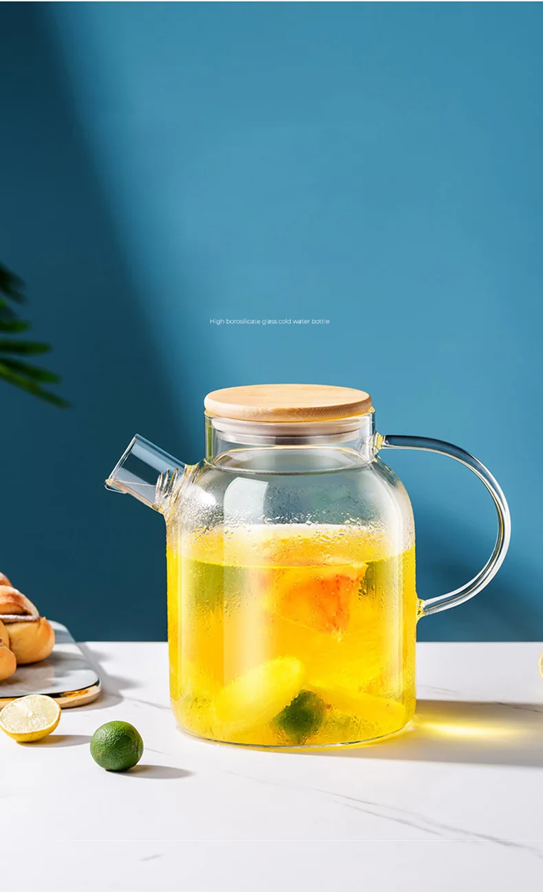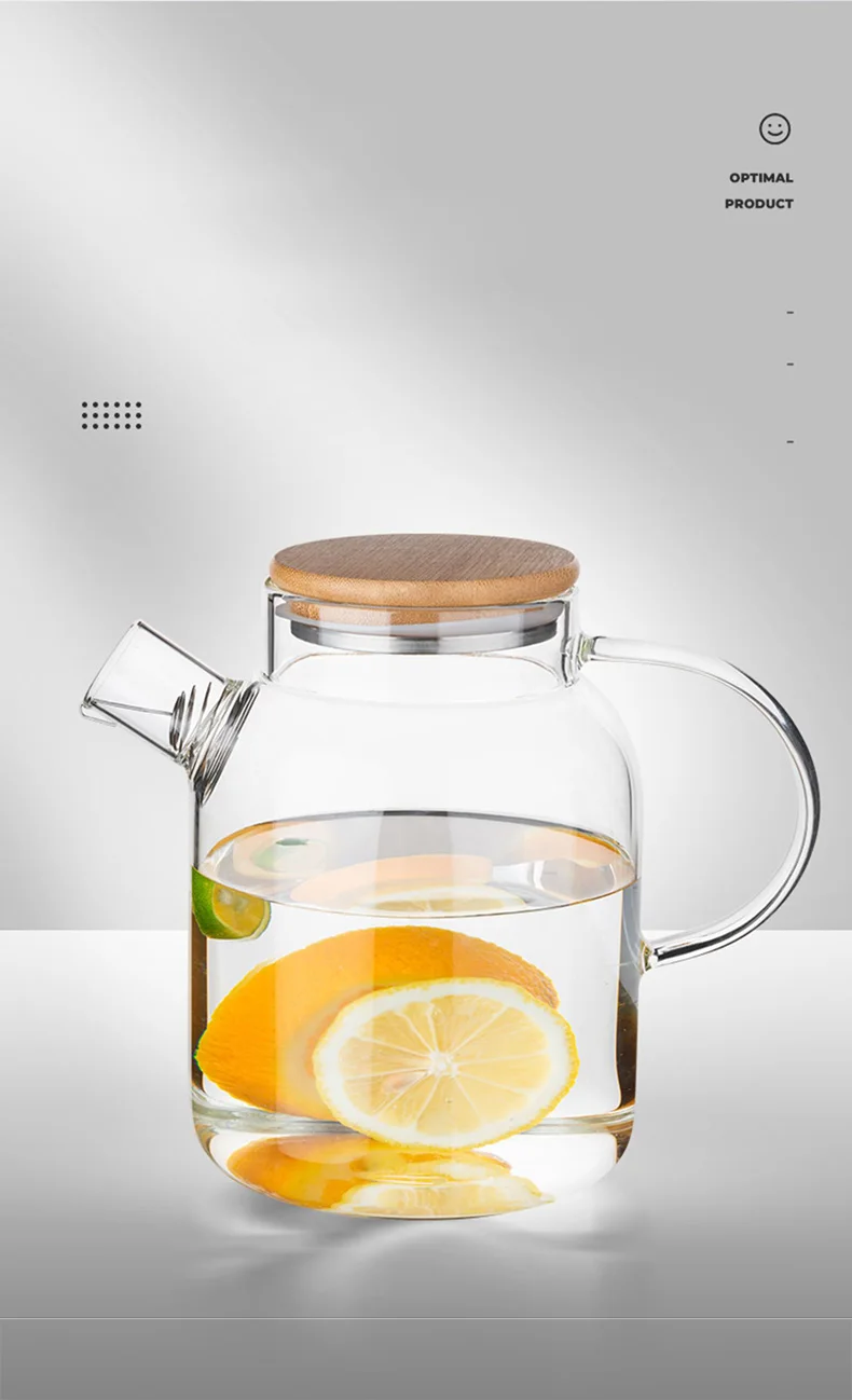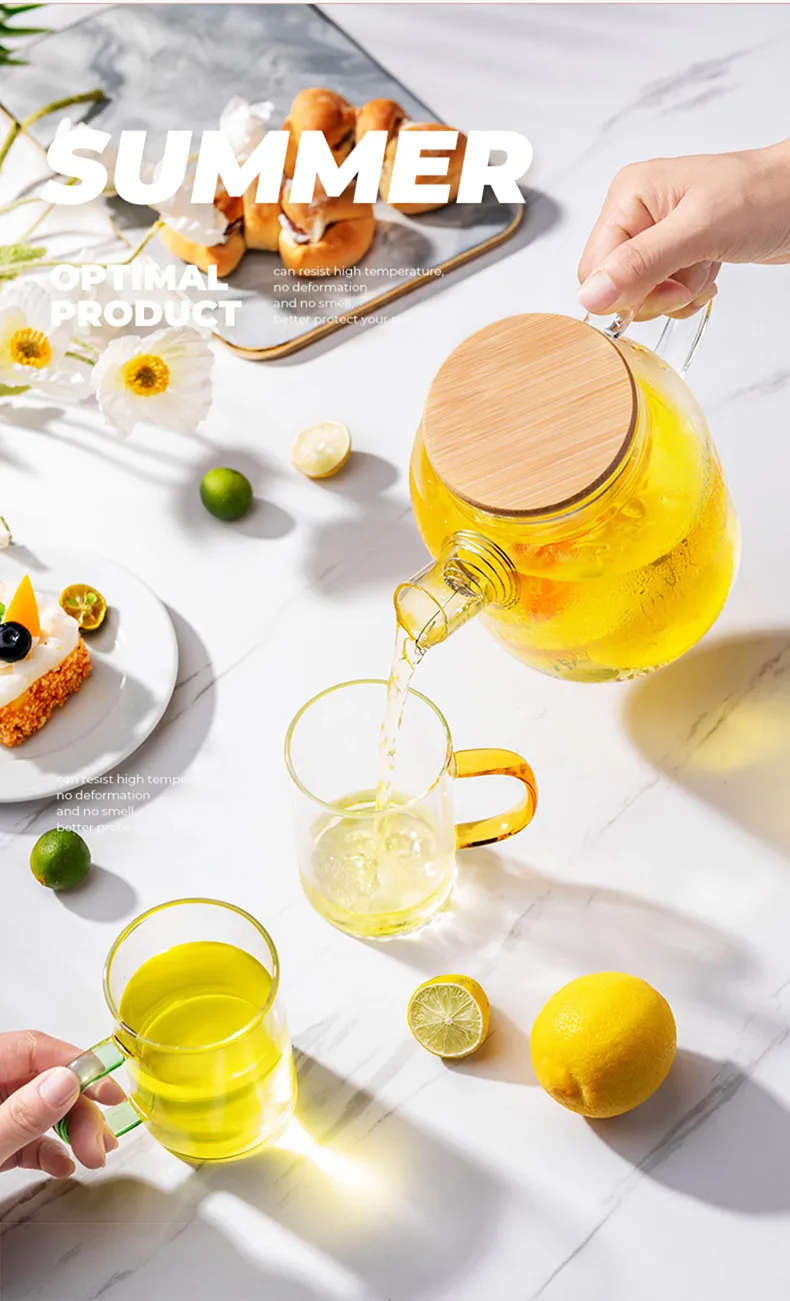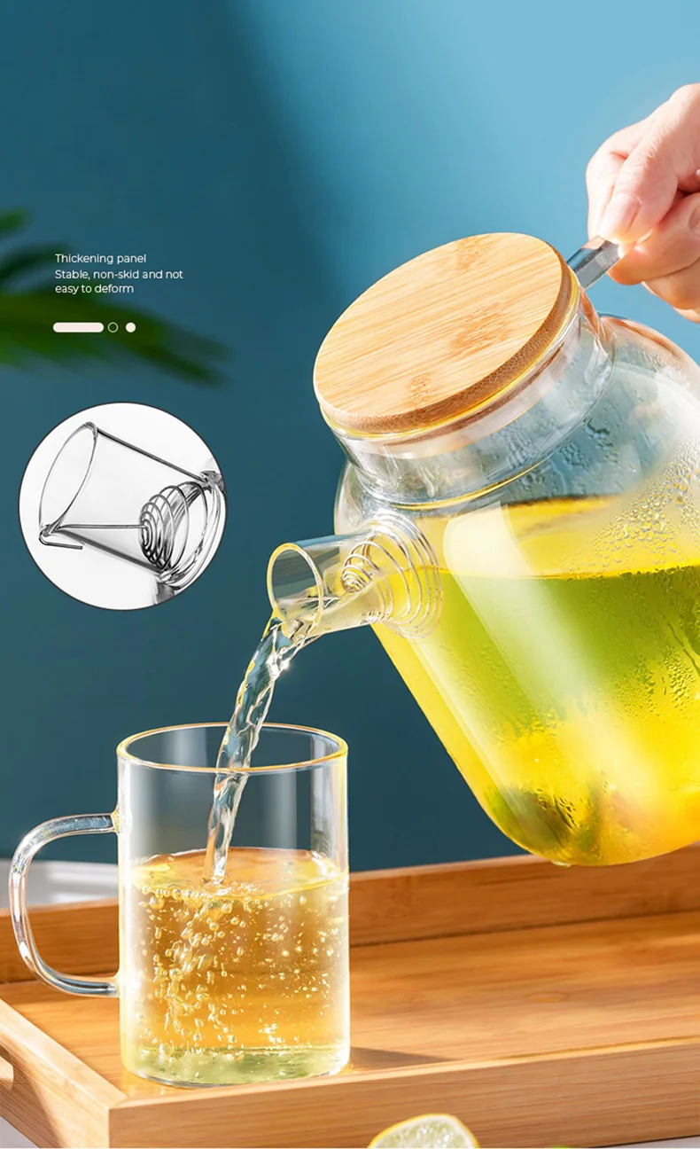 High borosilicate glass material, cold and heat resistant, can withstand 100 degrees instant temperature difference, bamboo wood steel cover, stainless steel reinforcement, durable, lid tight, easy to pour water does not fall, anti-scalding widened handle, strong and firm, the cup body is easy to clean